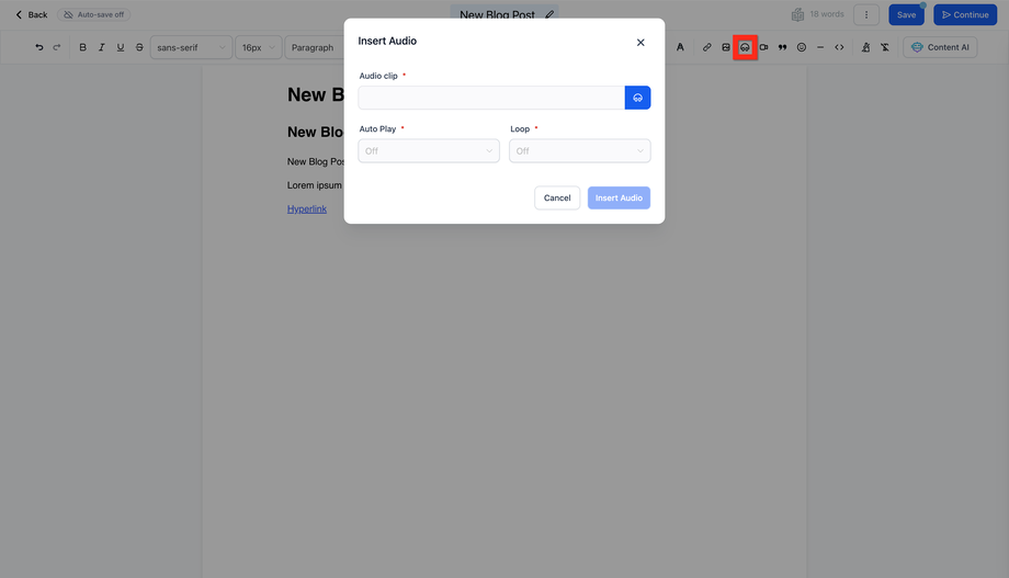 Audio: Kopfhörer-Symbol → Datei aus Media Library wählen → Insert Audio.