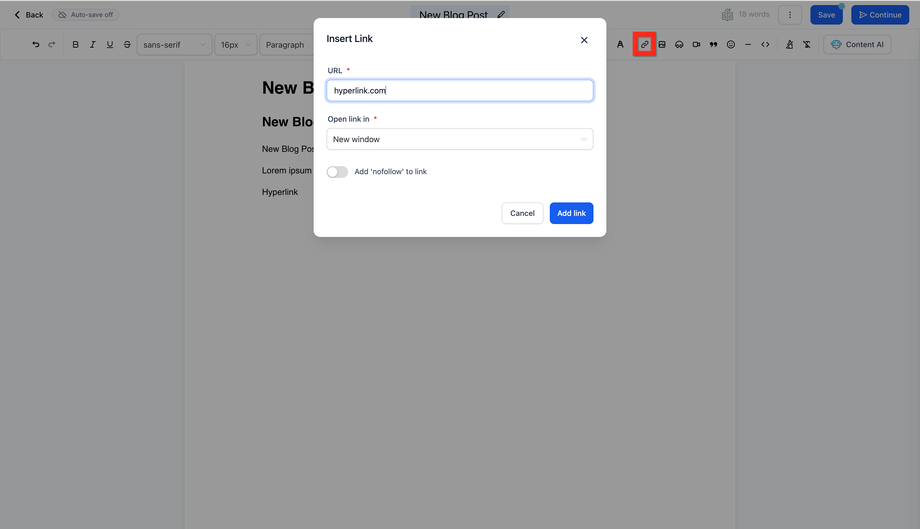 Hyperlinks hinzufügen: Text markieren → Ketten-Symbol → URL eingeben → Add Link.