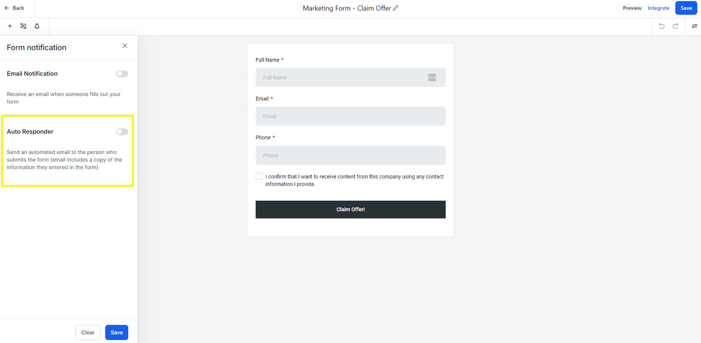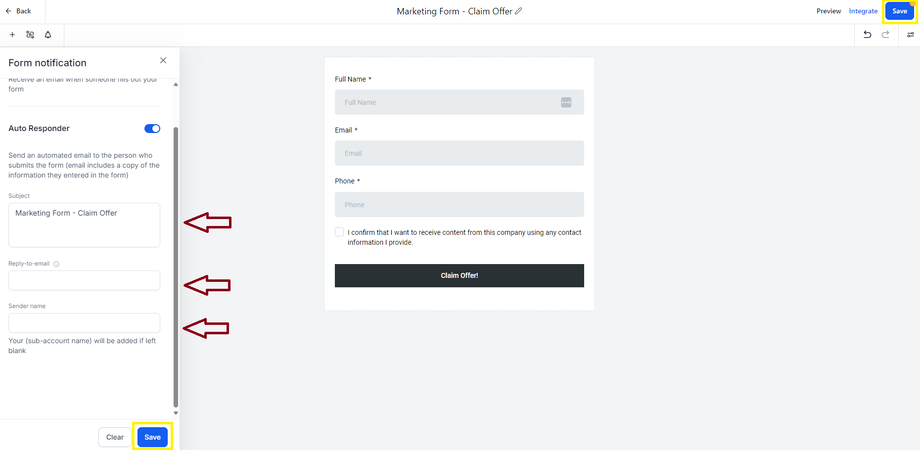 Sobald aktiviert, sendet diese Funktion eine automatische Antwort an die Person, die das Formular ausfüllt, sowie optional Benachrichtigungen an interne Teammitglieder.