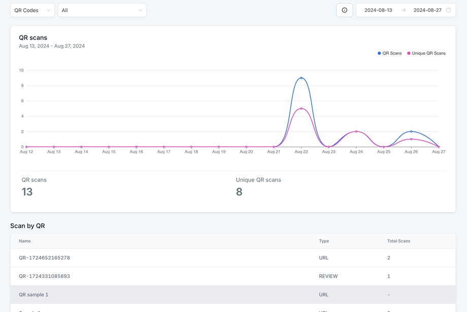 5. Für Analytics zu QR Codes gehe zu „QR Codes“ > „Analytics“. Dort findest du Analytics zu allen QR Codes mit gesamten und eindeutigen Scans.