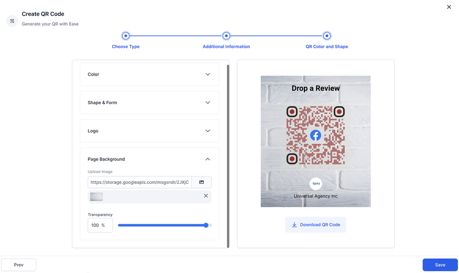 4. Du kannst Farbe, Form und Gestaltung, zentrales Logo sowie Hintergrundbild des QR Codes bearbeiten. Du kannst den QR Code testen und das Bild von hier im PNG-Format herunterladen. Klicke auf „Speichern“, um den QR Code zu veröffentlichen.