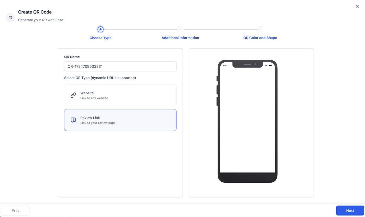2. Füge einen Namen hinzu und wähle als „QR-Typ“ die Option „Review Link“. Klicke anschließend auf „Weiter“.