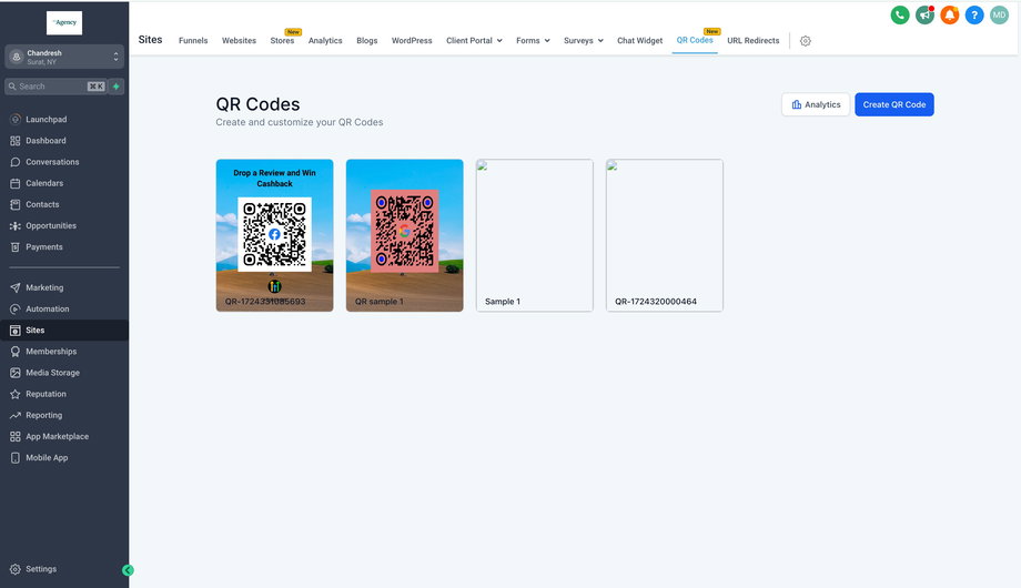 1. Um einen QR Code zu erstellen, der mit deiner Website verknüpft ist, gehe zu „Sites“ > „QR Codes“ > „QR Code erstellen“.