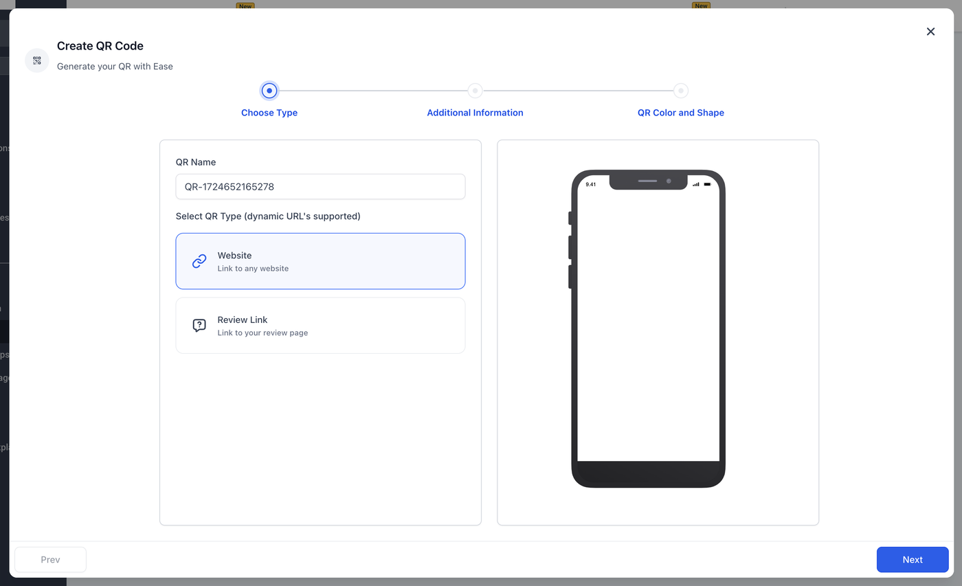 2. Füge einen Namen hinzu und wähle als „QR-Typ“ die Option „Website“. Klicke anschließend auf „Weiter“.