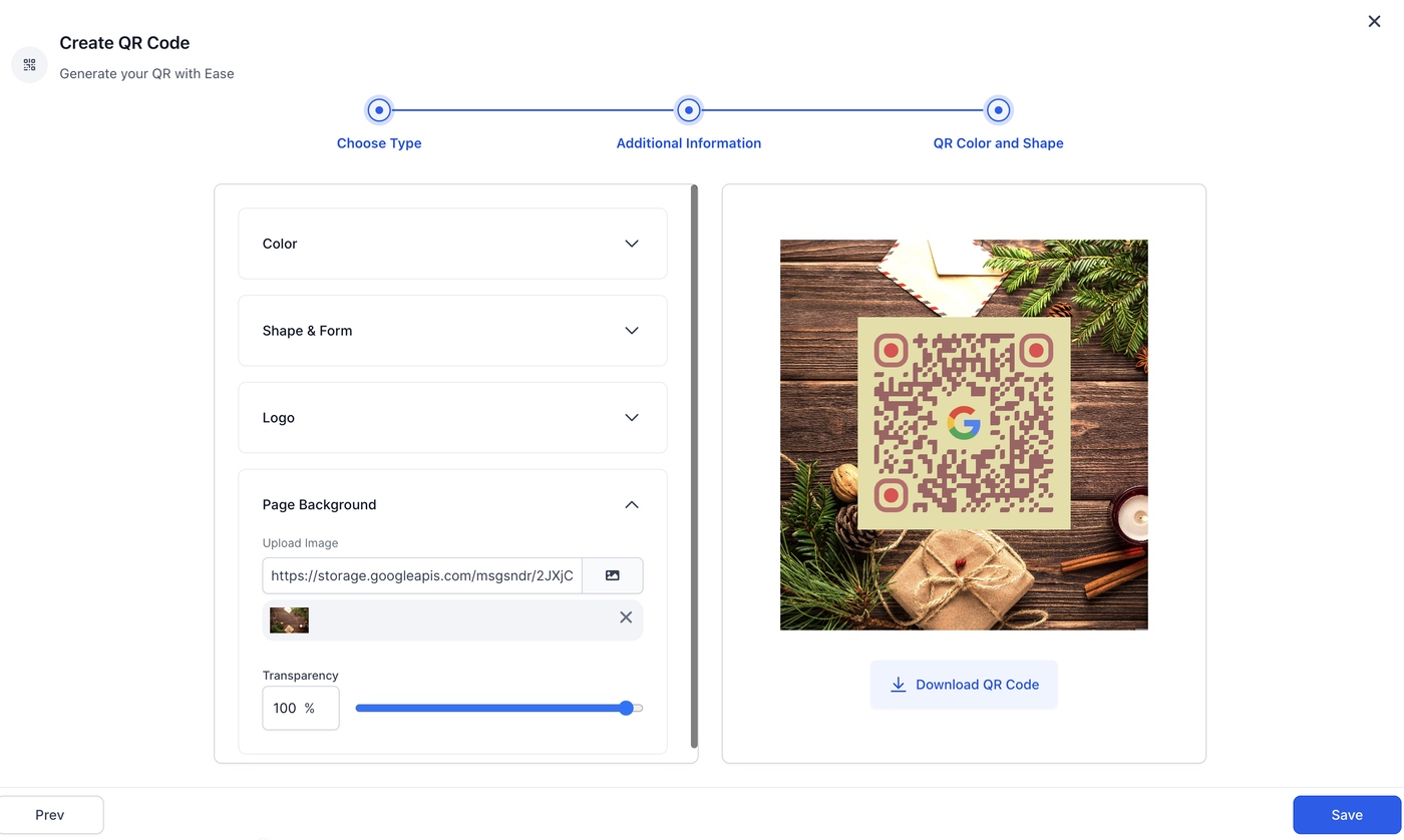 4. Du kannst Farbe, Form und Gestaltung, zentrales Logo sowie Hintergrundbild des QR Codes bearbeiten. Du kannst den QR Code testen und das Bild von hier im PNG-Format herunterladen. Klicke auf „Speichern“, um den QR Code zu veröffentlichen.