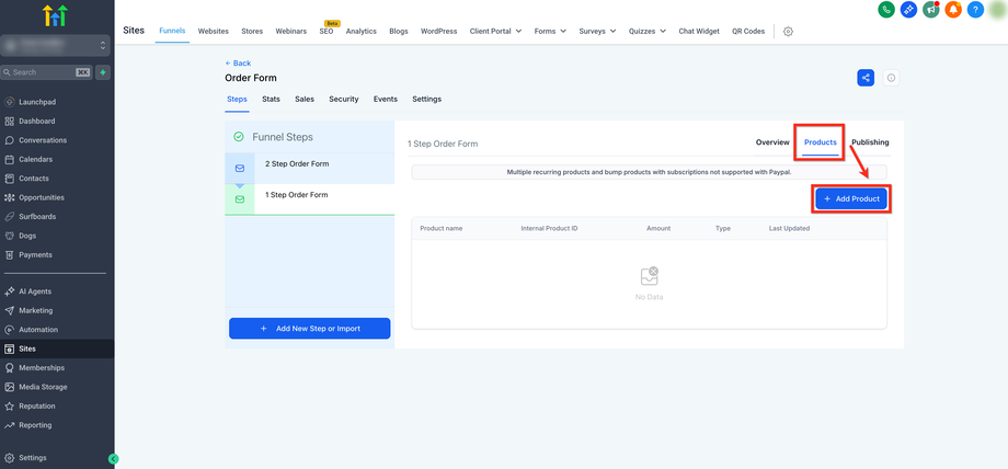 Produkte müssen dem Funnel-Step zugewiesen werden, bevor das One-Step Order Form sie anzeigen und abrechnen kann. Befolgen Sie diese Schritte, um sicherzustellen, dass Produkte und Preise im Formular verfügbar sind.