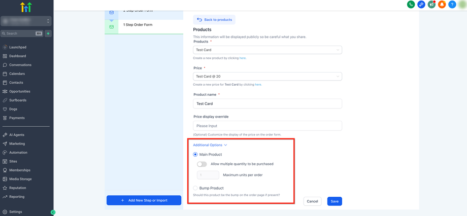 Klicken Sie auf Additional options, um Allow multiple quantity zu aktivieren, Max per order festzulegen und das Produkt als Main product oder Bump product zu markieren.
