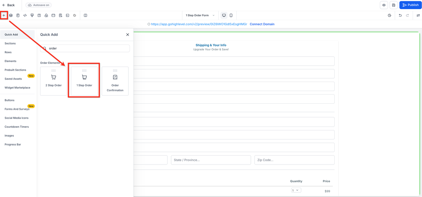 Nachdem Produkte dem Step hinzugefügt wurden, folgen Sie diesen Schritten, um das One-Step Order Form-Element in Ihrem Funnel einzufügen und zu konfigurieren.