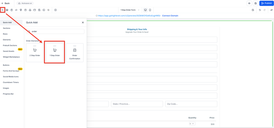 Schritt 2: One-Step Order Form-Element hinzufügen