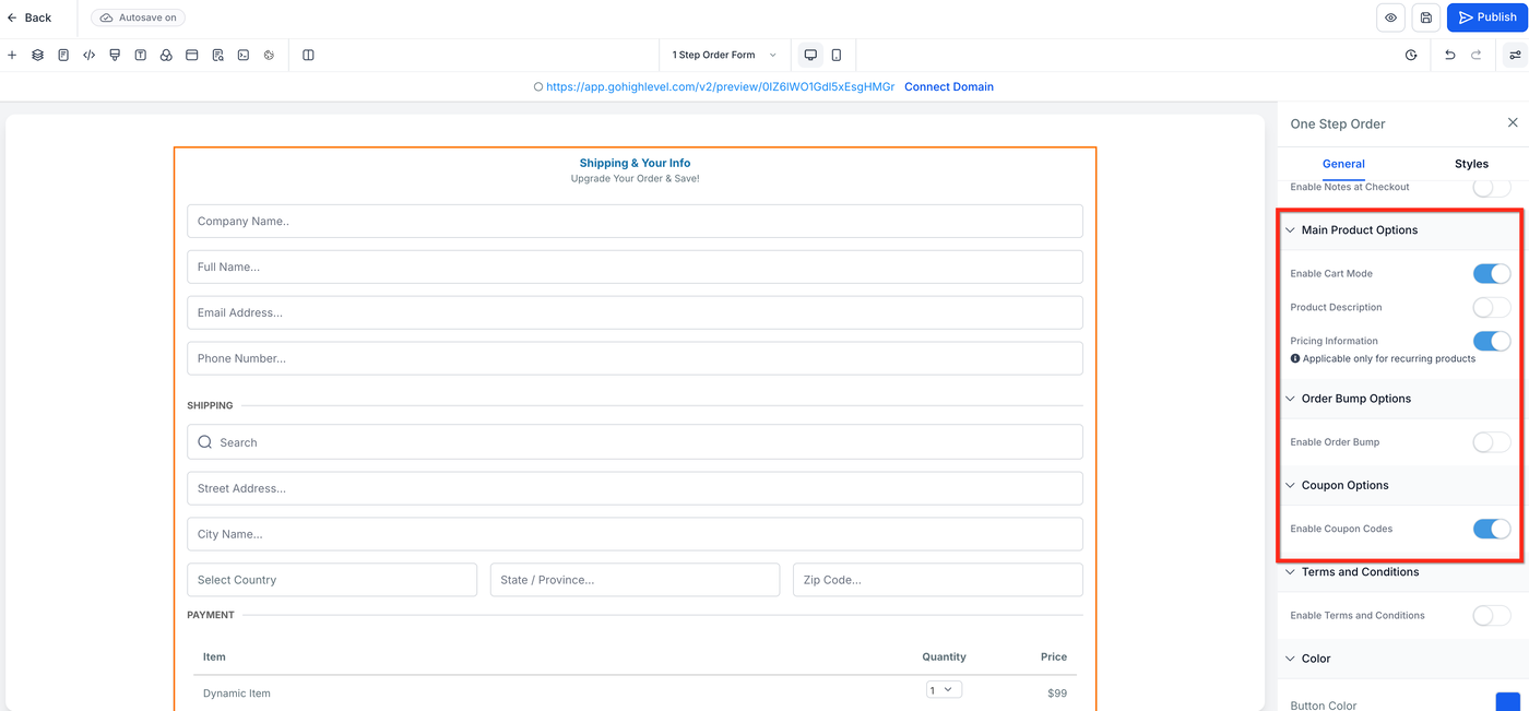 One-Step Order Forms können in Funnels hinzugefügt werden. Erwägen Sie die Migration zu V2, um neuere Einstellungen wie Cart Mode zu nutzen.