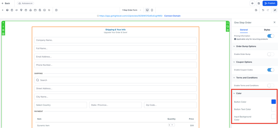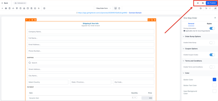 Klicken Sie vor der Veröffentlichung oben rechts auf Preview, um Ihr Order Form zu testen. Nach erfolgreicher Prüfung klicken Sie auf den blauen Publish-Button.