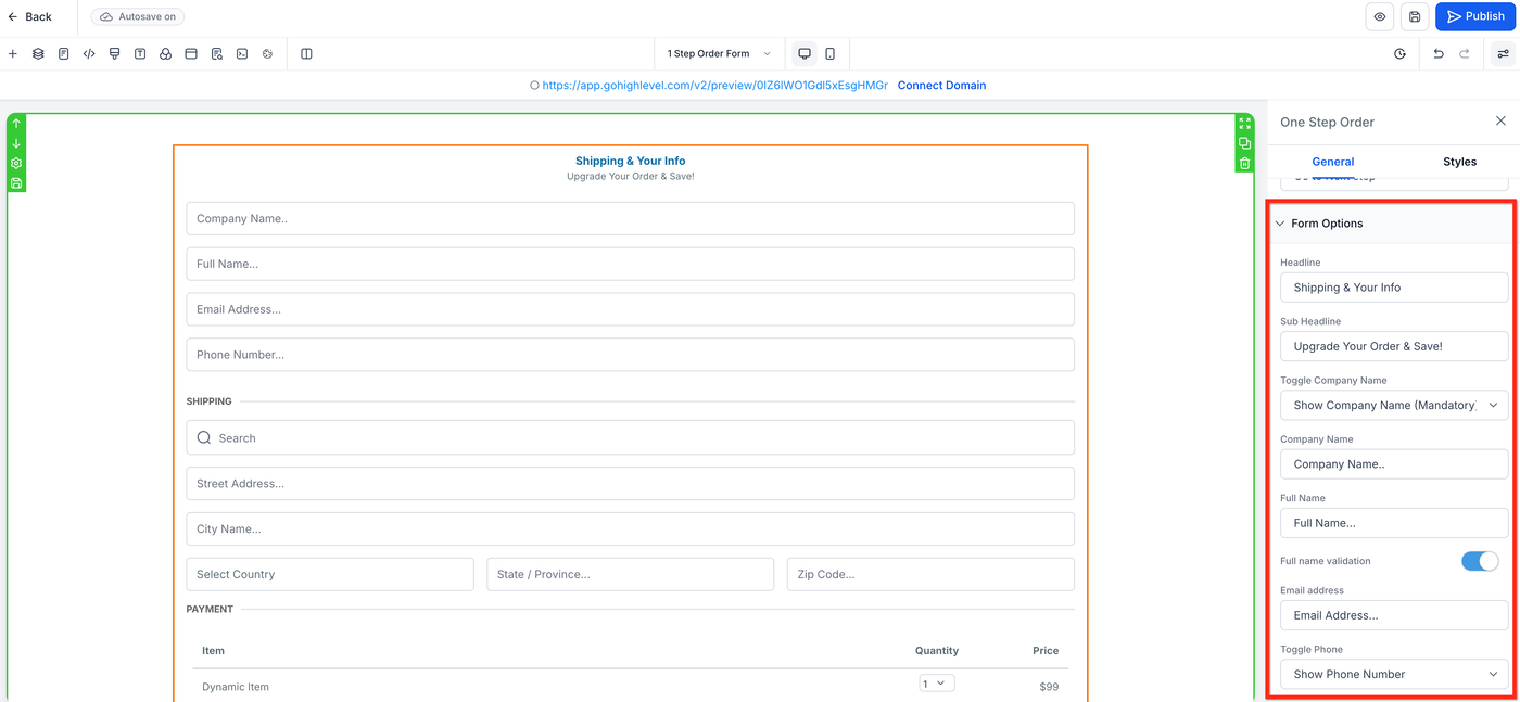 Öffnen Sie in den Element-Einstellungen die Form options. Hier können Sie alle Formularfelder konfigurieren, z. B. Company Name, Shipping und Price.