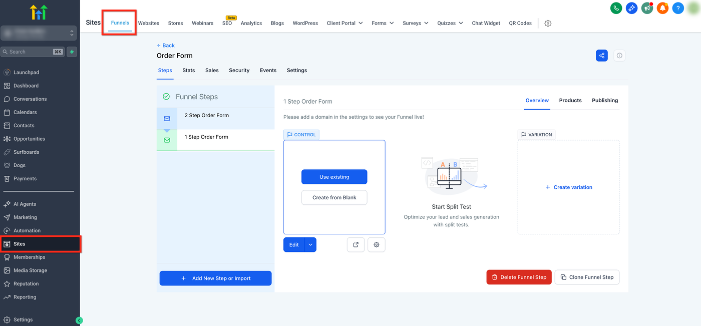 Gehen Sie in der linken Navigation zu Sites, öffnen Sie Ihren Funnel und wählen Sie den gewünschten Funnel-Step aus.