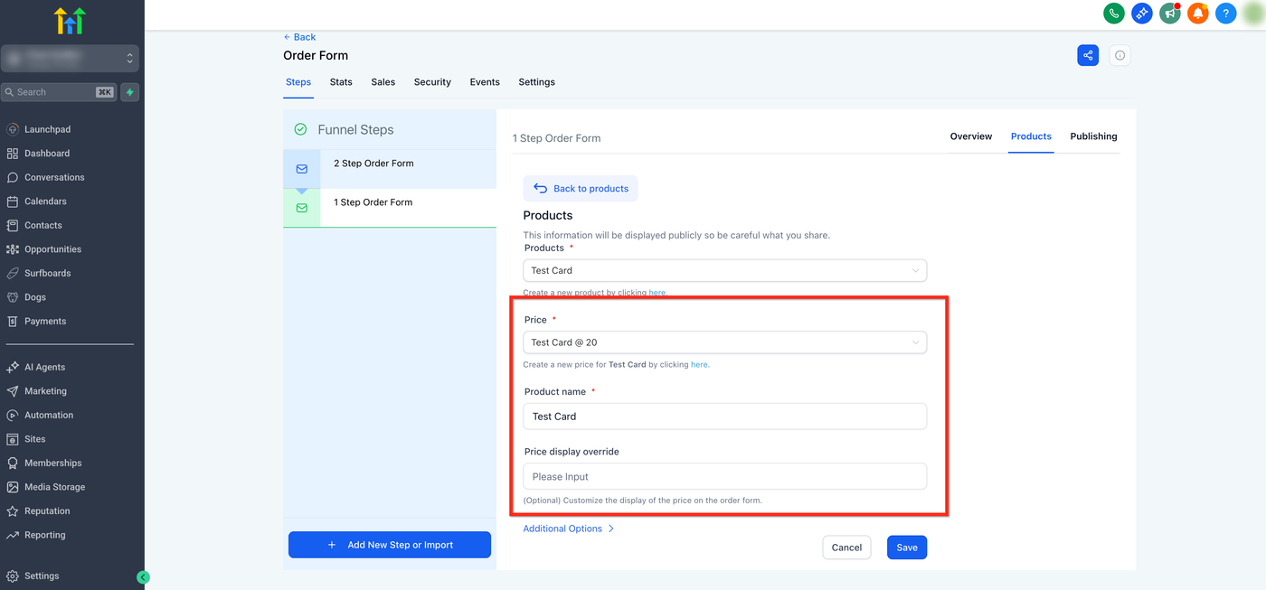 Optional können Sie Product Name Override verwenden, um den angezeigten Produktnamen im Order Form anzupassen, oder Price Display Override, um die Preisanzeige im Formular individuell zu gestalten.