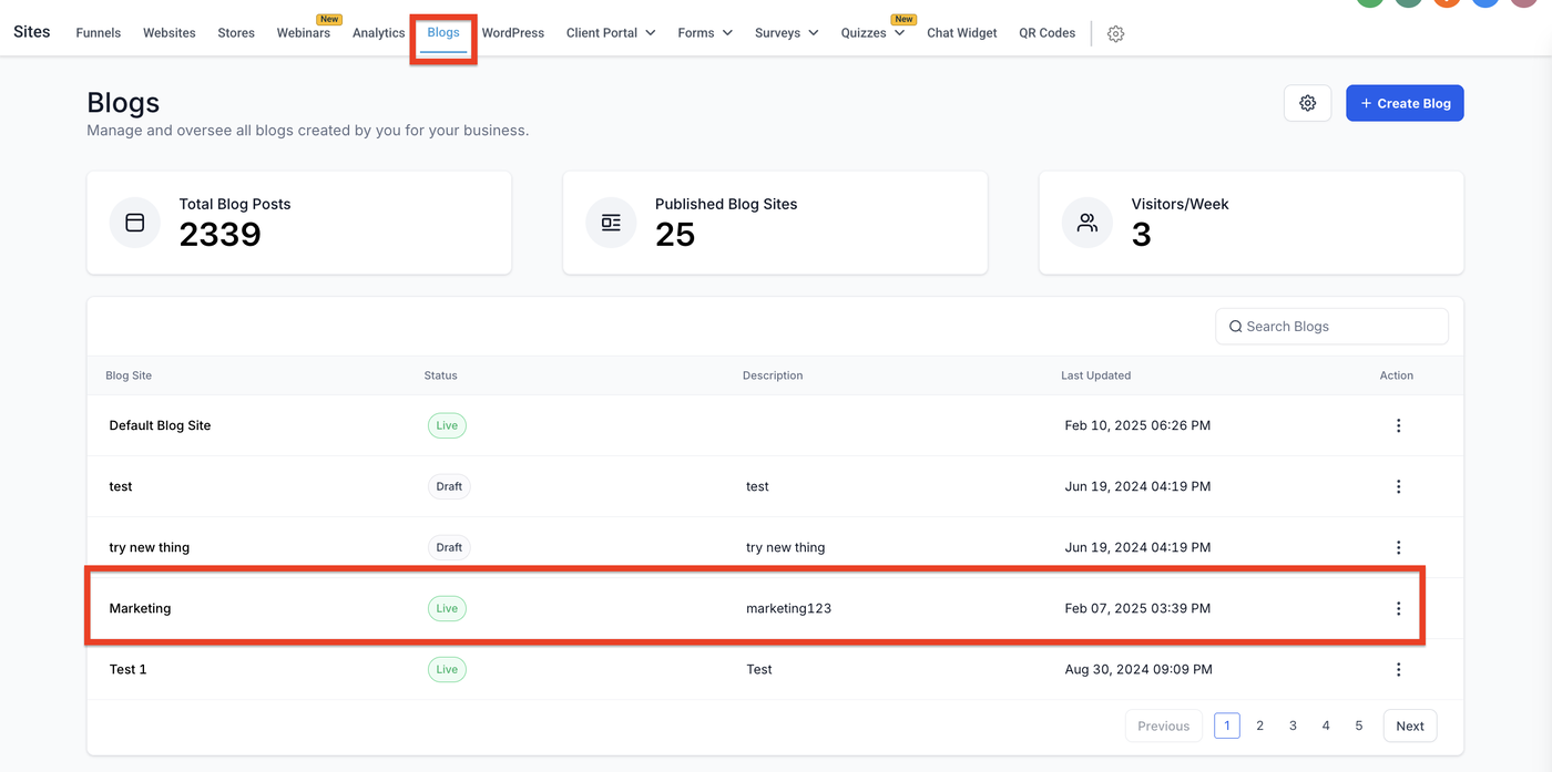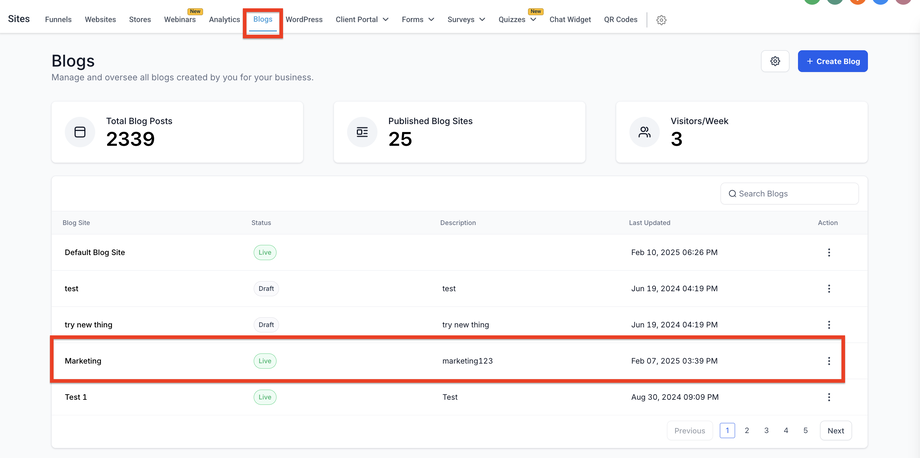 Navigieren Sie zu Sites → Blogs.