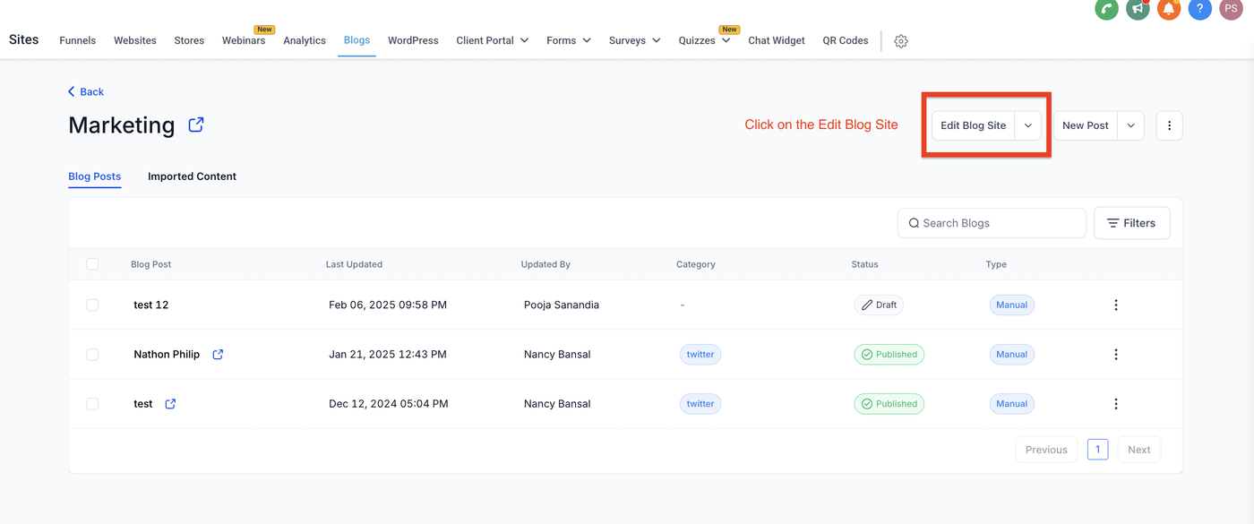 Gehen Sie zur Ansicht, in der Sie Blog Site bearbeiten können.