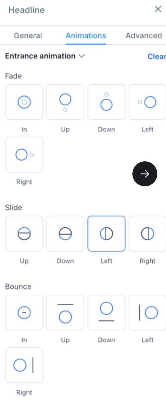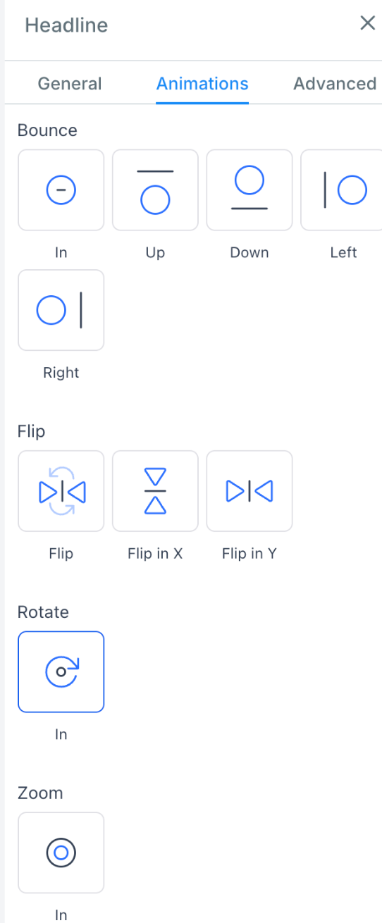 Wähle aus verschiedenen Eingangsanimationen wie Fade, Slide, Bounce, Rotate und Zoom.