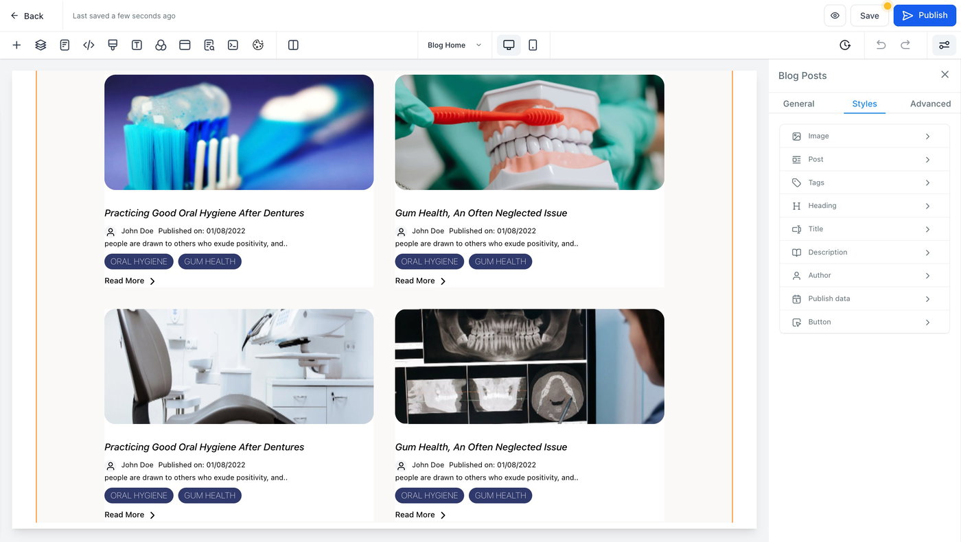 Sie können das Layout bearbeiten, festlegen, was in den Blogkarten angezeigt wird, und den Stil der Blogposts anpassen.