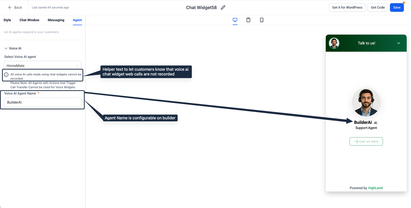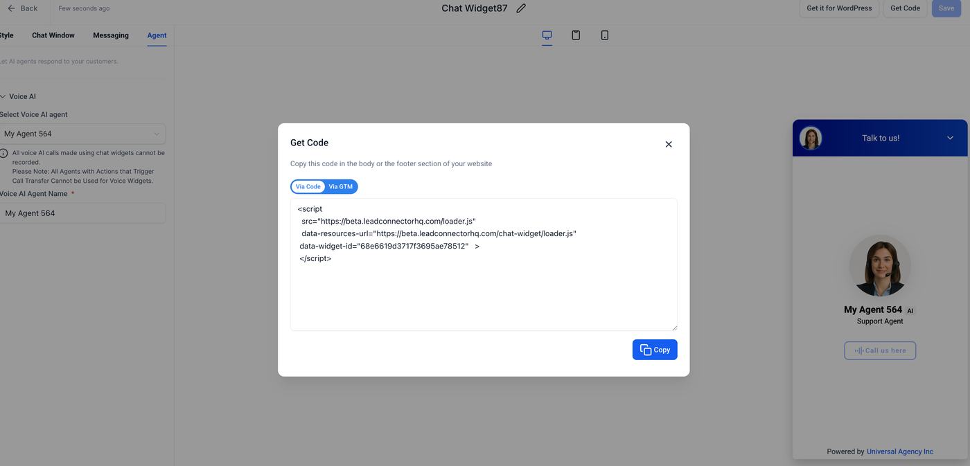 Der „Bot“ ist dein Voice AI Agent. Gehe dazu in deinem Sub-Account zu AI Agents → Voice AI und erstelle oder bearbeite dort den Agenten. Stelle sicher, dass das Setup abgeschlossen ist, bevor du ihn im Widget verwendest.
