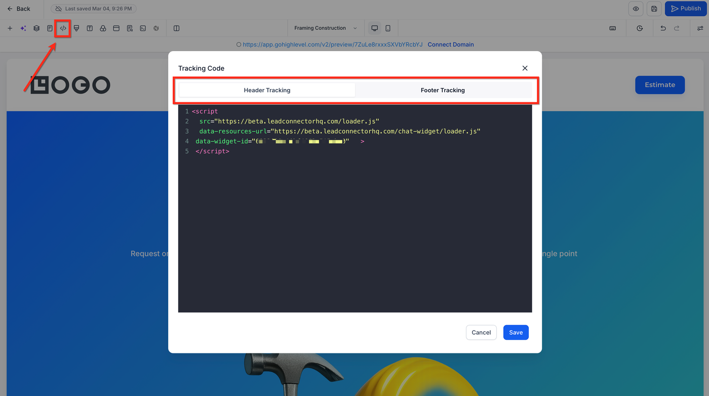 <script>-TagFüge den Code in den Bereich Tracking Code im Header oder Footer deiner Website oder deines Funnels ein