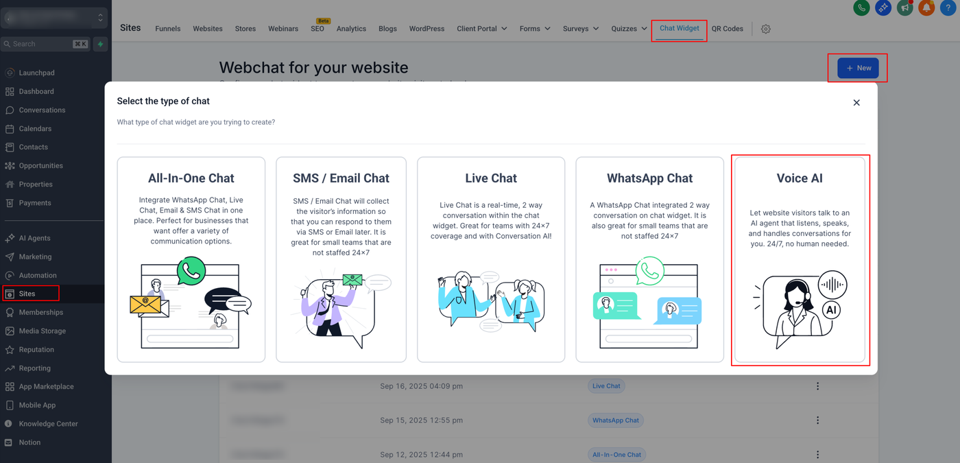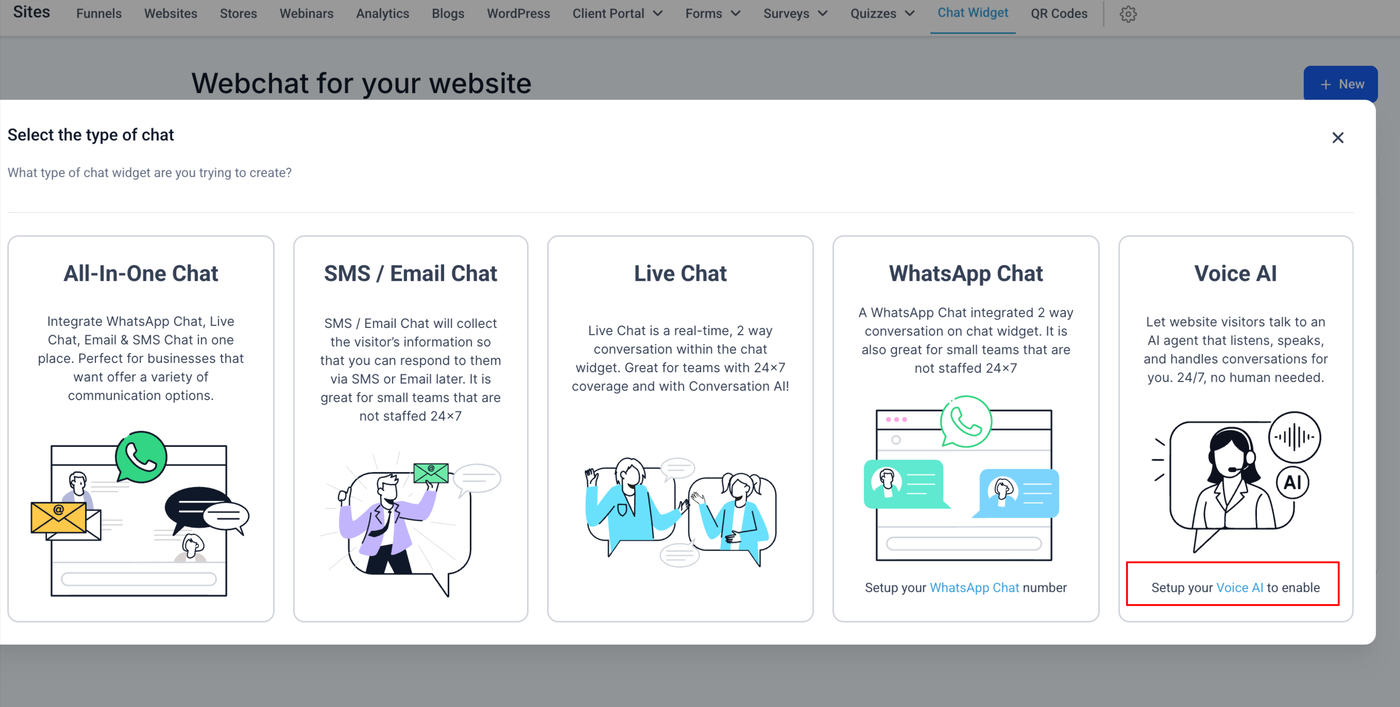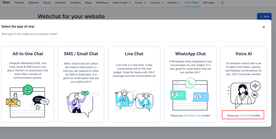 Sobald aktiviert, wird der Chat-Typ Voice AI im Chat Widget Builder verfügbar.