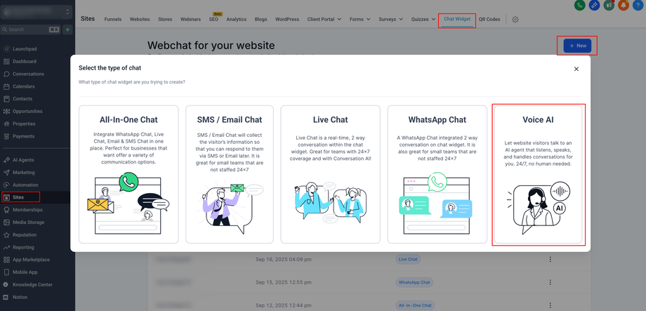 Hinweis: Du kannst kein Voice AI Chat Widget erstellen, solange dein Voice AI Setup und die Erstellung des Agenten nicht abgeschlossen sind.