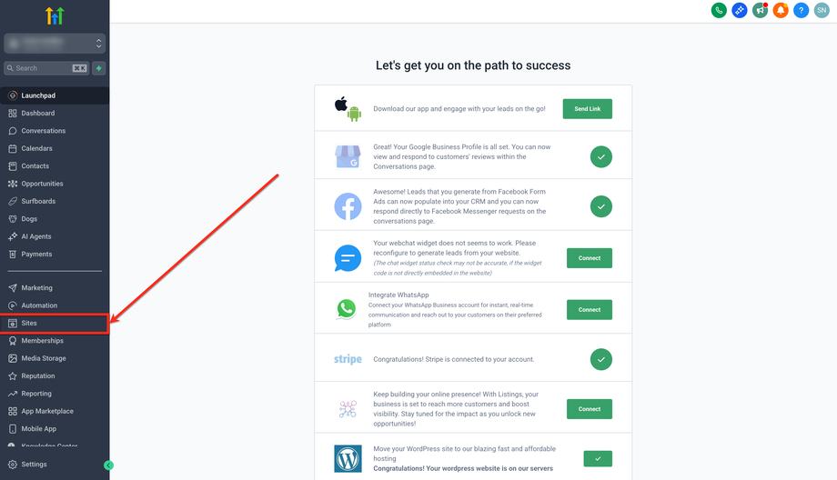 Klicken Sie in Ihrem Sub-Account auf Sites.