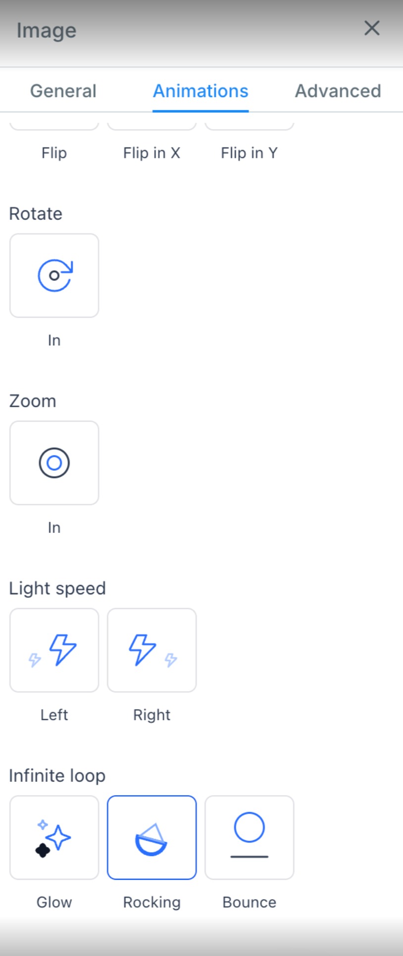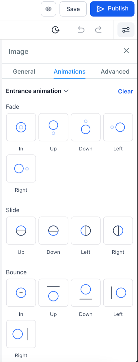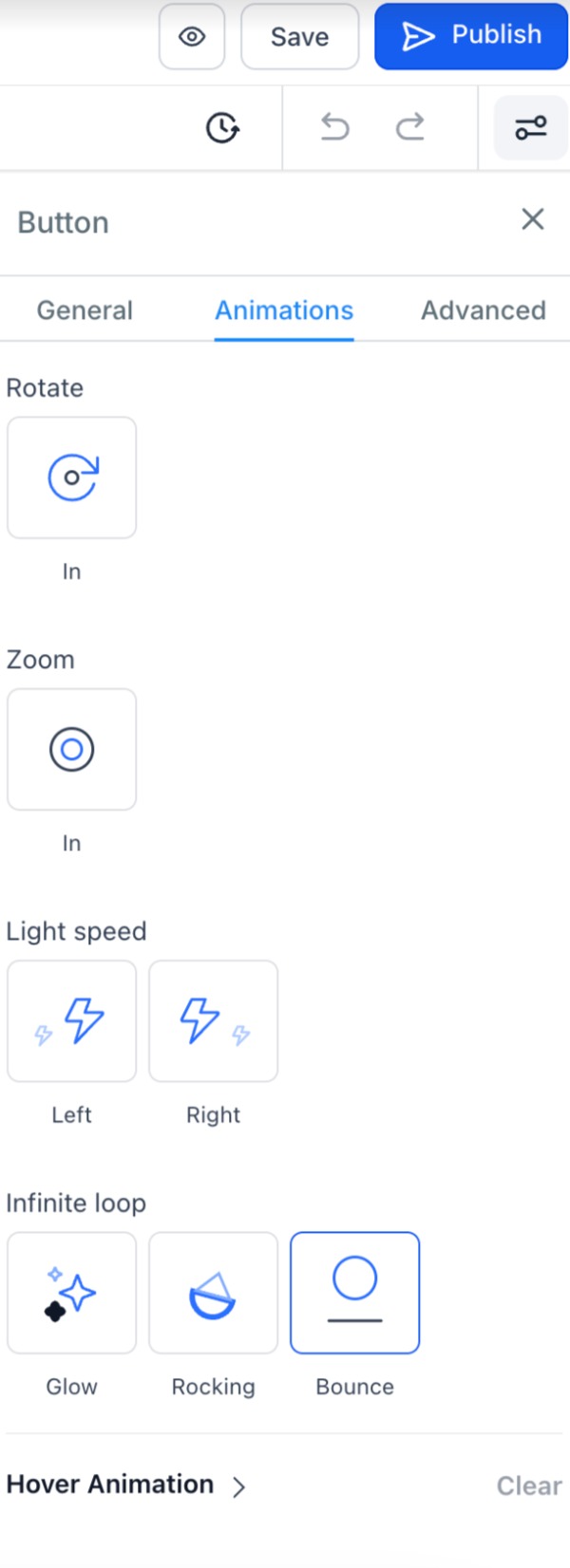 Wähle aus verschiedenen Entrance-, Hover- und Loop-Animationen wie Fade, Slide, Bounce, Rotate und Zoom.