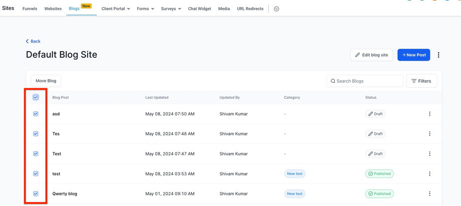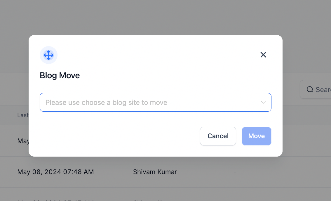Auf „Move Blog“ klicken, um die ausgewählten Blogposts zu verschieben