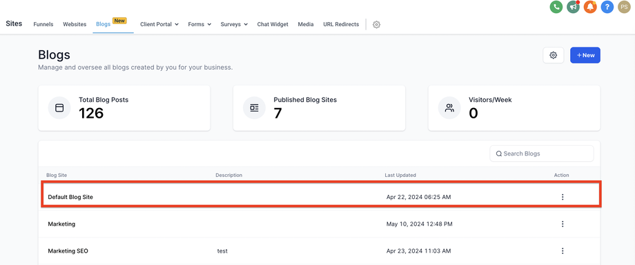 Wählen Sie den Default Blog, der in Funnels/Websites gehostet ist