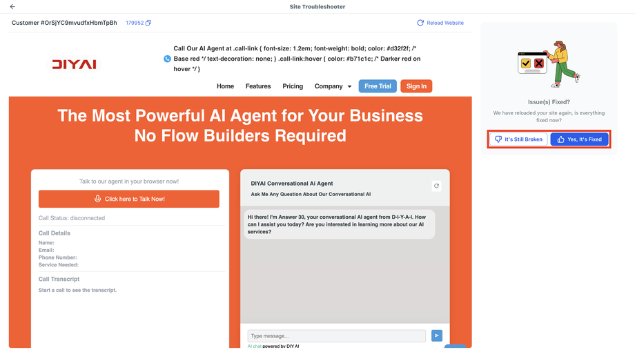 Auf dem Bildschirm Probleme behoben („Wir haben Ihre Website erneut geladen. Ist jetzt alles behoben?“):