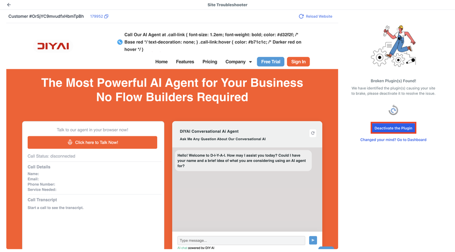 Wenn das Tool meldet „Defekte Plugins gefunden — Wir haben die Plugins identifiziert, die Ihre Website zum Absturz bringen“, klicken Sie auf Plugin deaktivieren, um das Problem zu beheben.