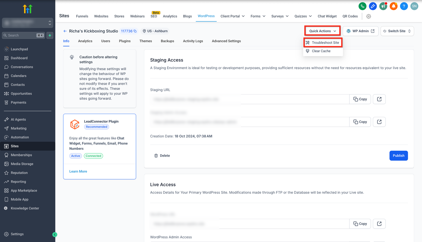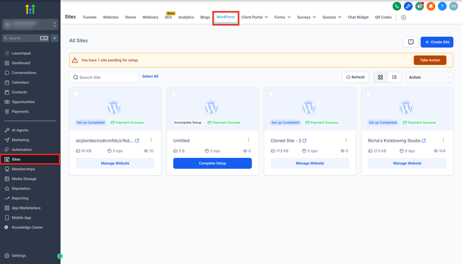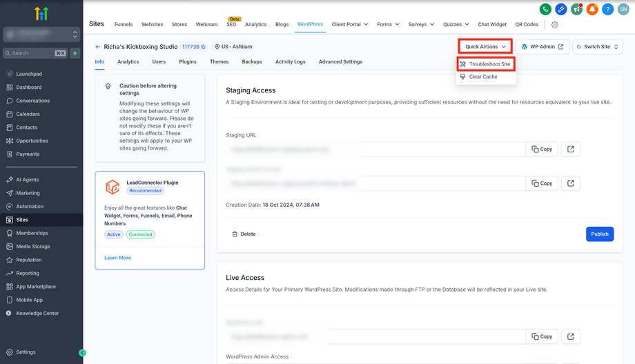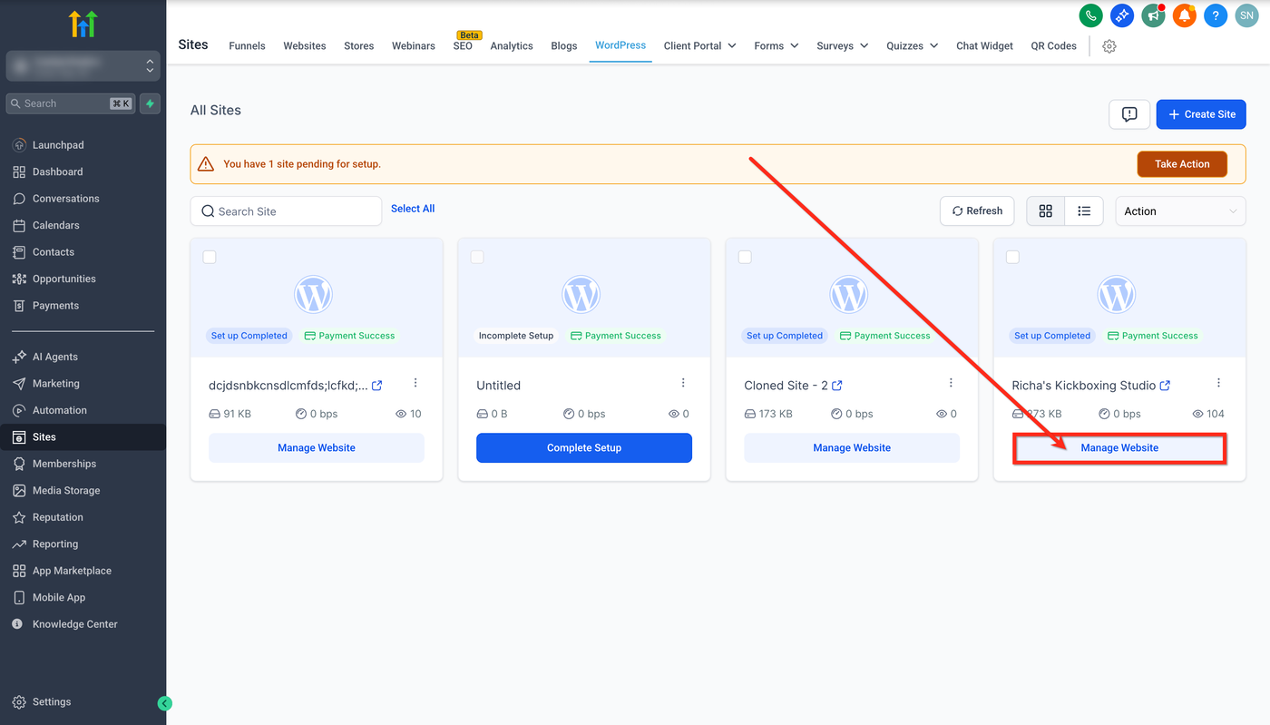 Klicken Sie auf der WordPress-Website, an der Sie arbeiten möchten, auf Website verwalten.