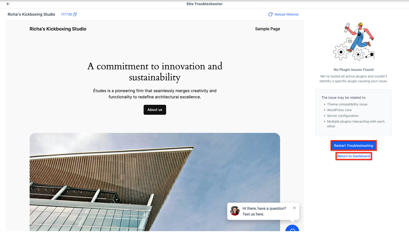Klicken Sie auf Troubleshooting neu starten, um den Prozess erneut auszuführen (z. B. Ihre Auswahl der „notwendigen Plugins“ anpassen und erneut testen).