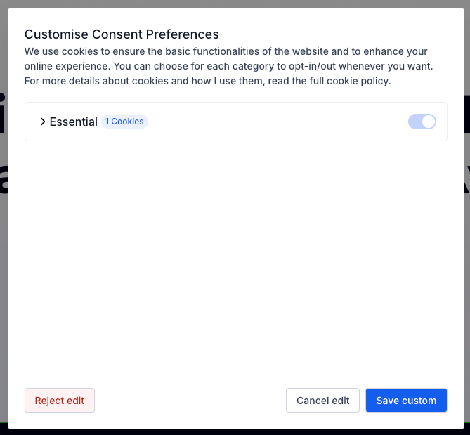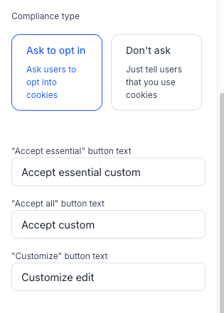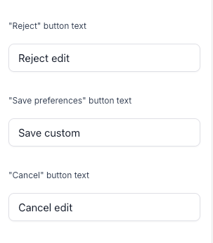 Du kannst nun den Text aller Buttons sowohl im Banner als auch im Einstellungs-Pop-up bearbeiten, um ihn an deine Marke und Lokalisierungsanforderungen anzupassen.