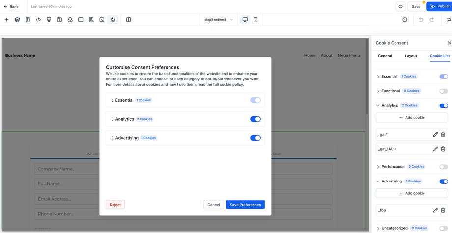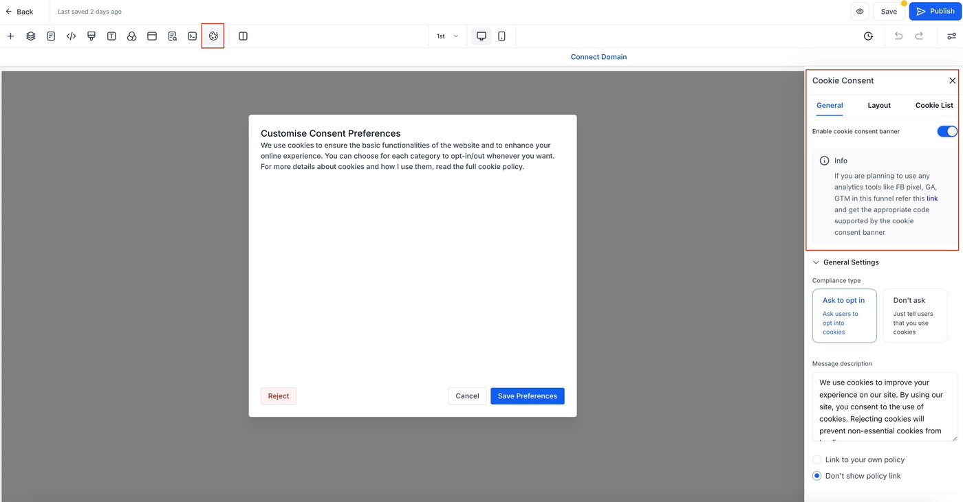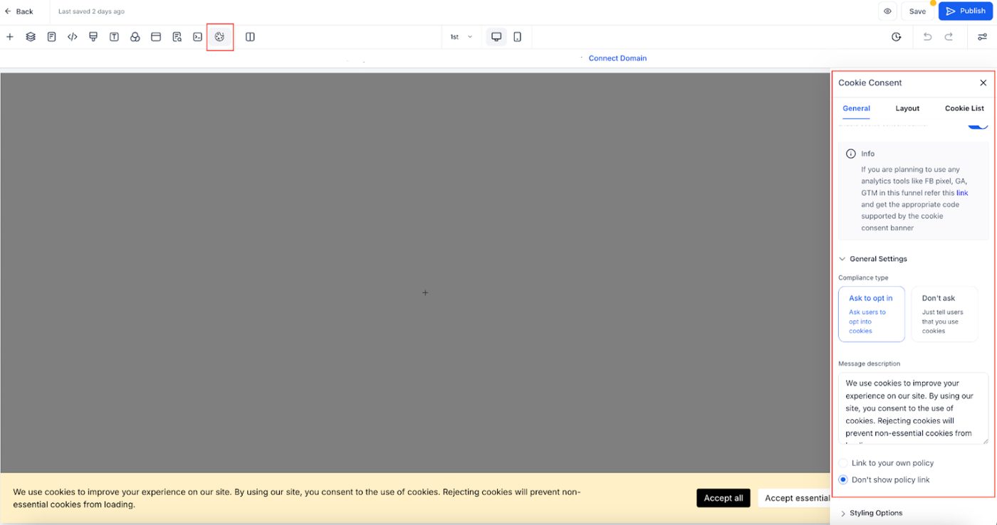 Diese Anleitung zeigt dir, wie du das Cookie-Consent-Banner in Funnels & Websites einrichtest, anpasst und verwaltest. Wenn du diese Schritte befolgst, kannst du dein Compliance-Programm unterstützen und Besuchern die Kontrolle über ihre Cookie-Einstellungen geben.