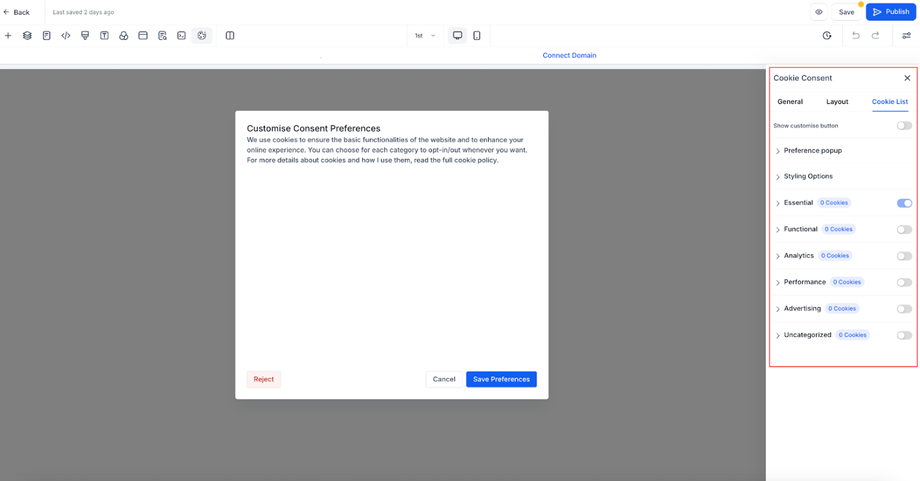 Mit der Cookie-Listen-Funktion können Nutzer verschiedene Cookie-Typen aktivieren oder deaktivieren. Wenn aktiviert, können Besucher auswählen, welche Cookies sie zulassen möchten.