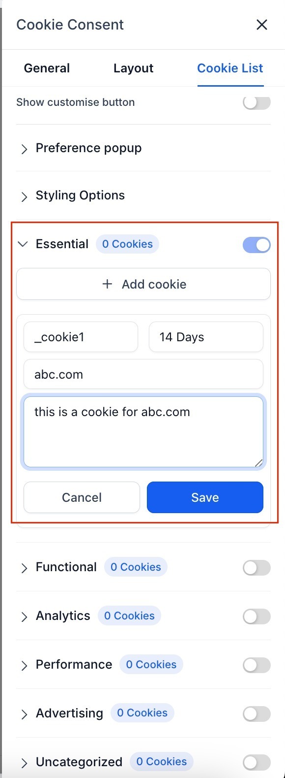 Verwende klare und einfache Beschreibungen für jedes Cookie.