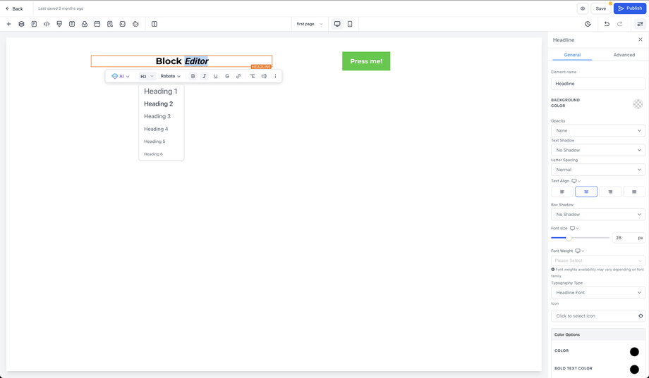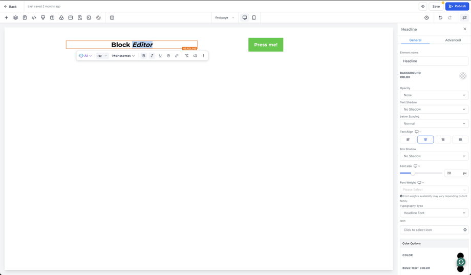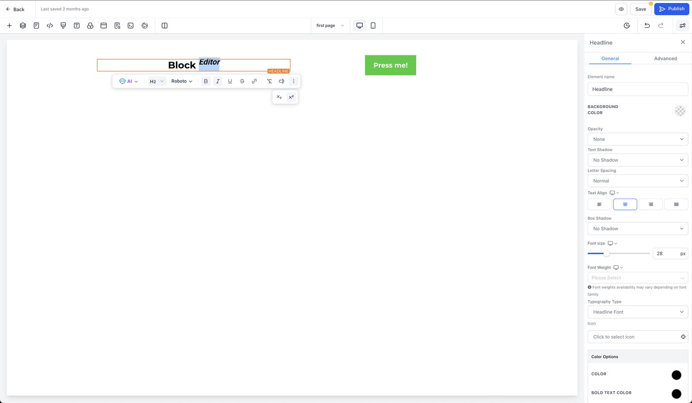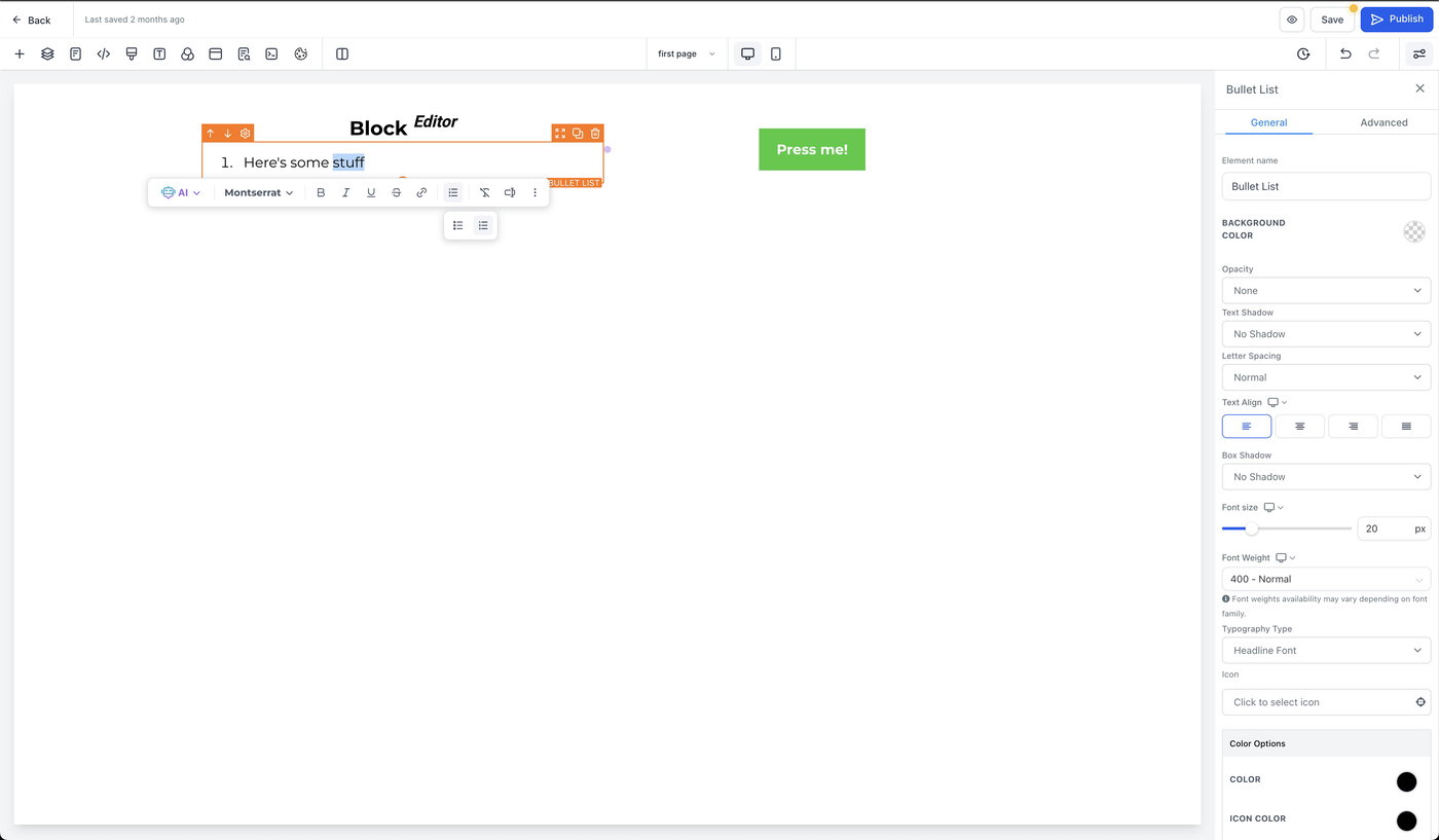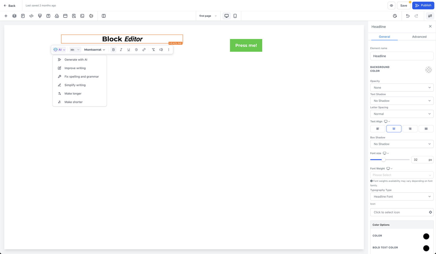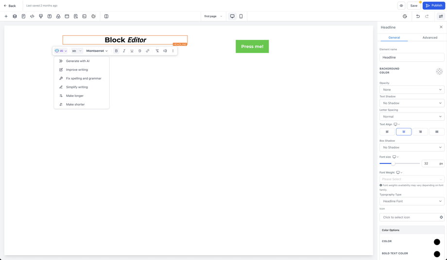 Der Block Editor ist für die manuelle Textformatierung innerhalb eines Elements konzipiert (zum Beispiel Fettschrift, Aufzählungen und Inline-Formatierungen). Für KI-gestützte Bearbeitungen in größerem Umfang – wie das Überarbeiten eines gesamten Abschnitts oder das Aktualisieren seitenweiter Stile – verwende KI-Seitenüberarbeitungen im Funnels & Websites KI-Workflow.