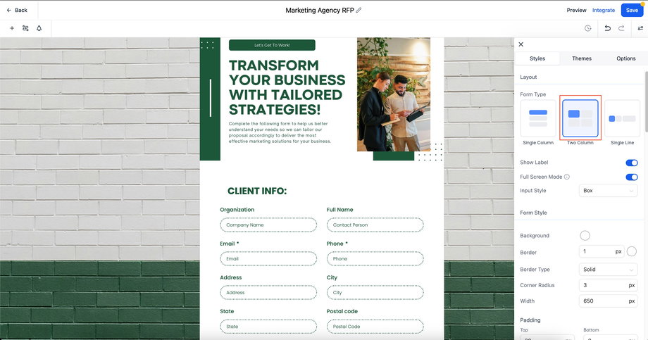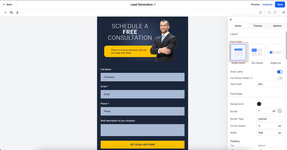 Drei vielseitige Layout-Optionen: Wähle zwischen Single Column, Two Column und Single Line, je nach Zweck und Aussehen deines Forms.