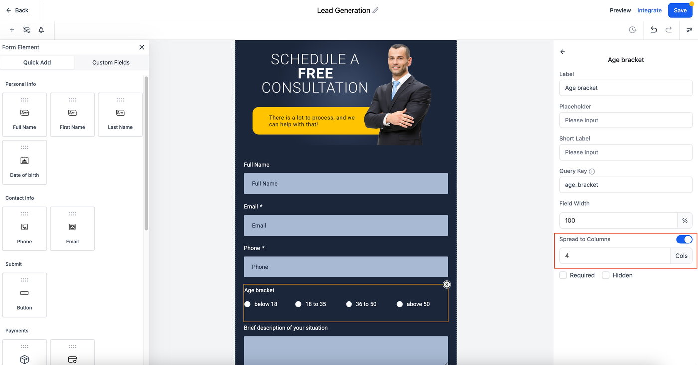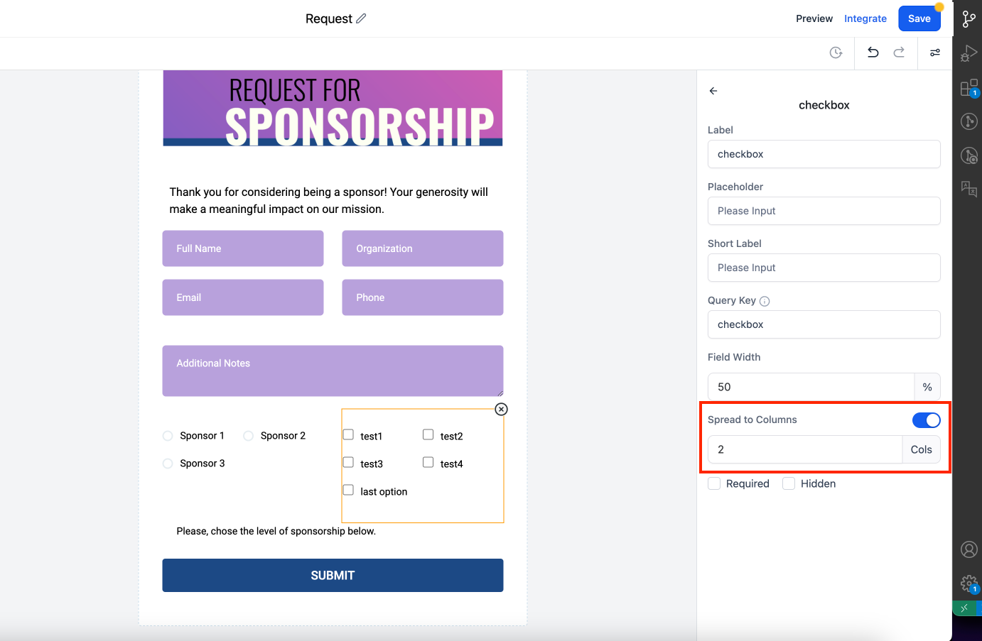 Wir freuen uns, die Einführung der „Spread to Column“-Funktion bekannt zu geben, die jetzt für Radio Buttons, Radio Images und Checkboxes in Forms und Surveys verfügbar ist. Mit dieser Funktion kannst du mehrere Spalten für Radio- und Checkbox-Optionen konfigurieren, wodurch Styling und Organisation deiner Forms verbessert werden.