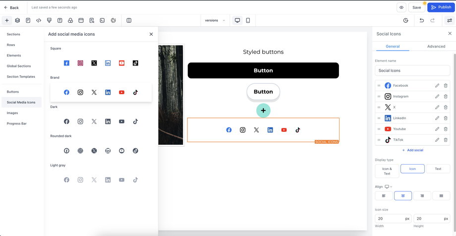 Erhöhe die Reichweite deiner Website und das Nutzerengagement mit einer umfassenden Auswahl vorgefertigter Social-Media-Icons. Icons für alle wichtigen Social-Media-Plattformen, darunter Facebook, Twitter, Instagram, LinkedIn und mehr.