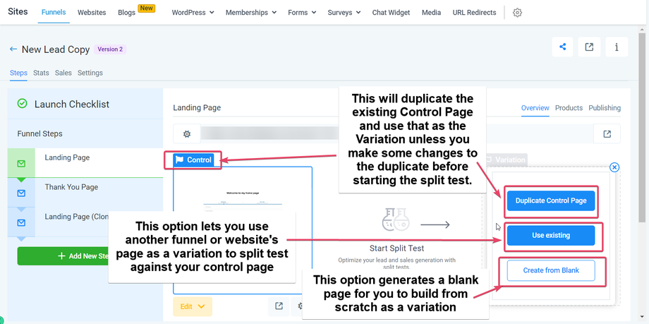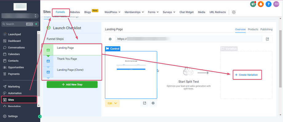 Wählen Sie den gewünschten Funnel-Step aus, in dem Sie den Split-Test erstellen möchten, und klicken Sie auf Create Variation.