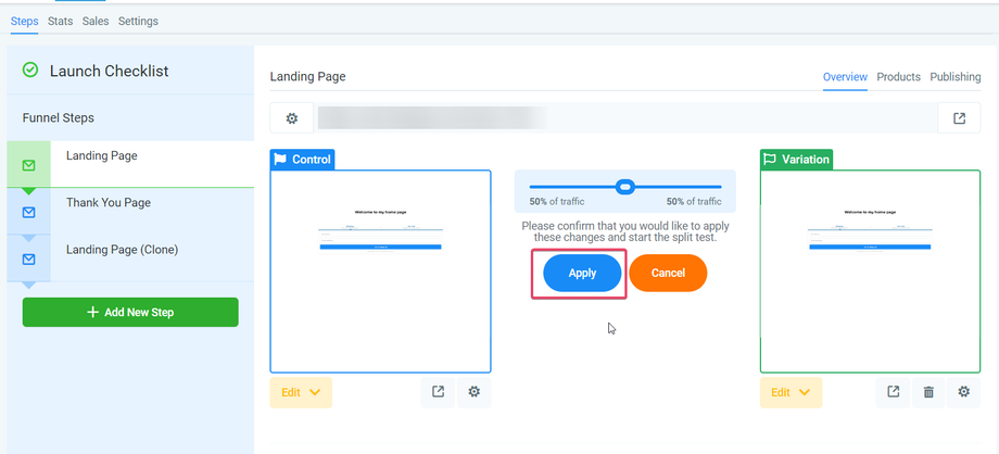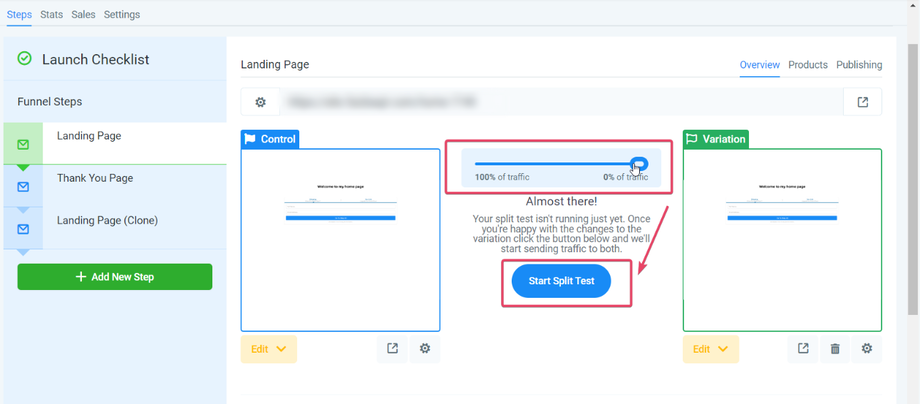 HINWEIS: Split-Testing ist nur möglich, wenn Sie eine Domain zu Ihrem Funnel hinzugefügt haben.