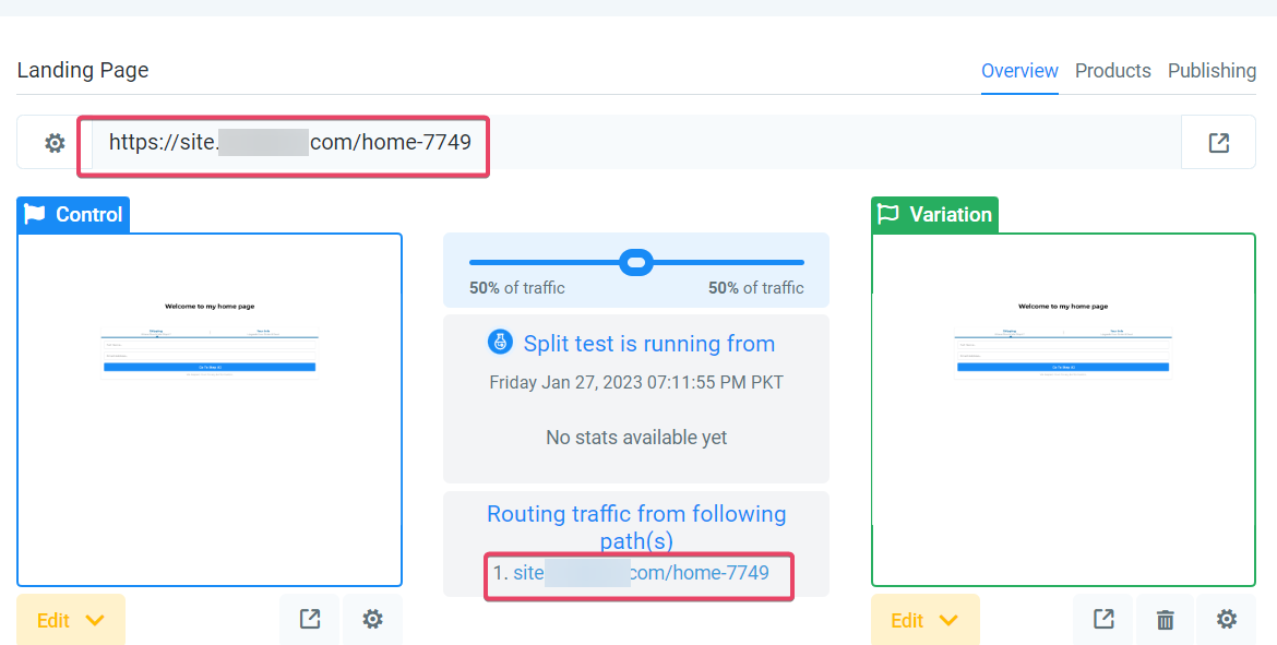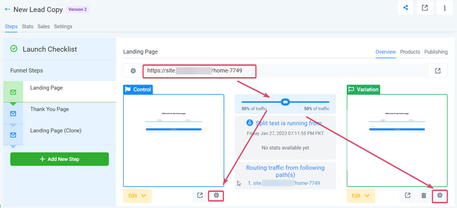 Obwohl der gesamte Traffic auf die URL Ihrer Seite geleitet wird, wird er dann gemäß dem Split-Test-Slider auf die dedizierten URLs für Control und Variation aufgeteilt. Die URLs können über das Gear Icon unter den jeweiligen Seiten bearbeitet werden.