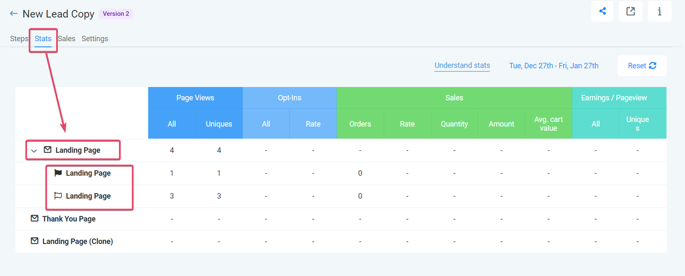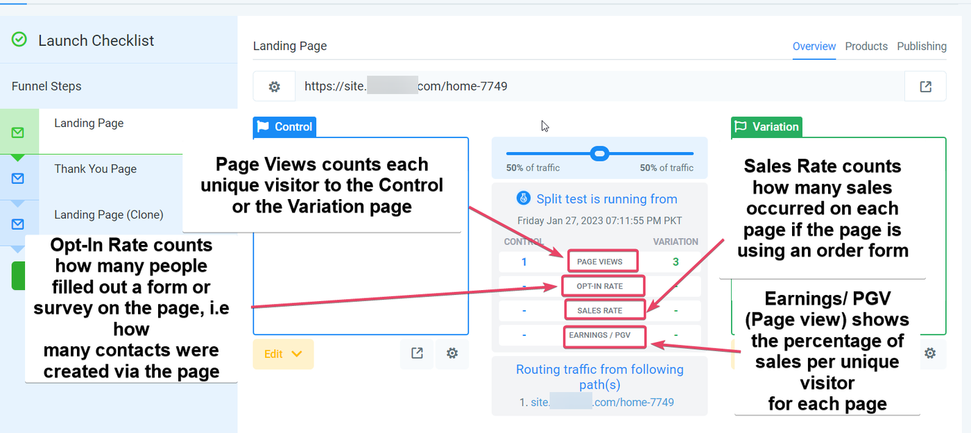 Detaillierte Statistiken können über den Stats-Tab der Seite eingesehen werden, indem Sie auf die Seite klicken und das Dropdown für Control und Variation öffnen.