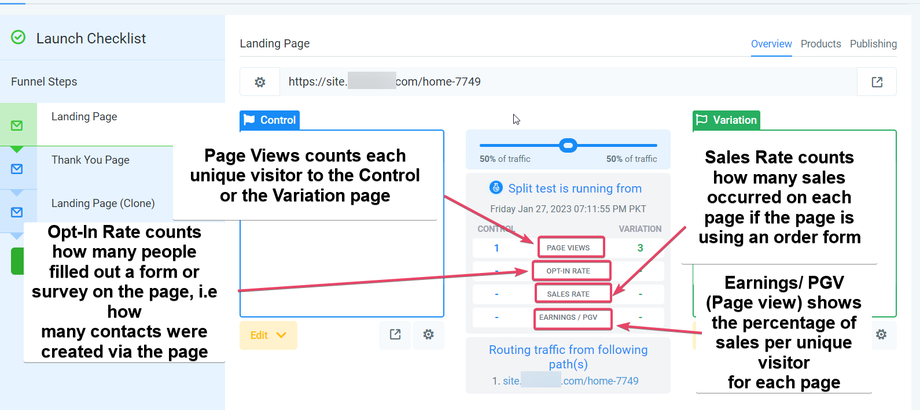 Split-Tests erlauben es, eine Funnel-Seite mit mehreren Varianten zu erstellen und dann darauf zu verlinken. Sie können beurteilen, mit welcher Wahrscheinlichkeit ein Lead Version A oder B besucht. Durch die Messung der Konversionsrate über einen bestimmten Zeitraum können Sie die Leistung der verschiedenen Seitenversionen vergleichen und diese Daten nutzen, um Ihren Funnel zu optimieren.