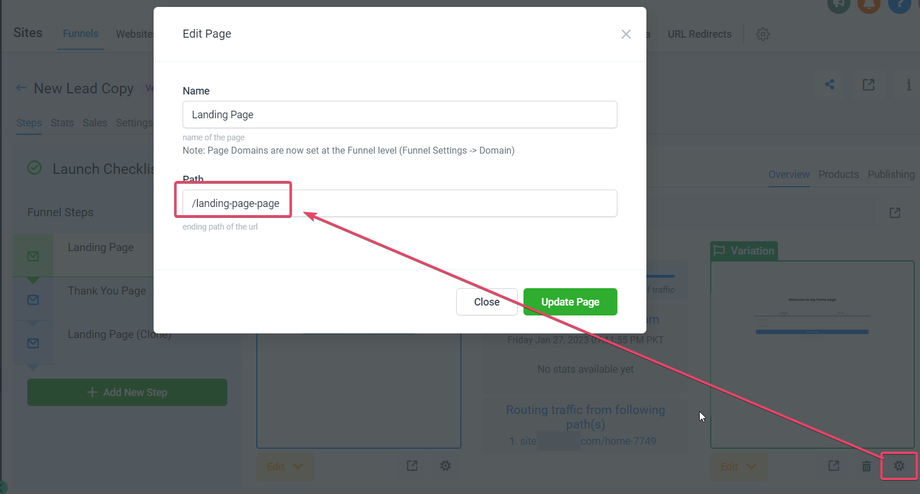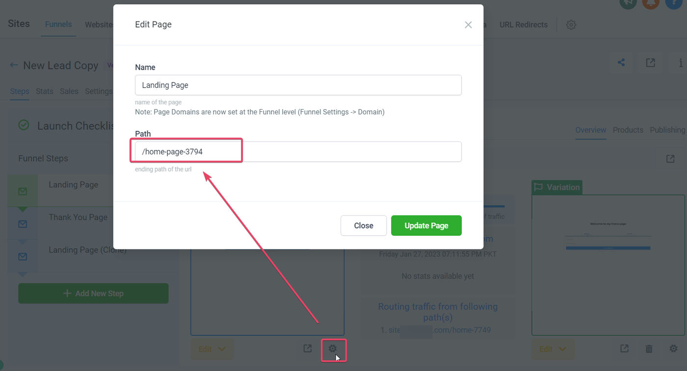 Das Zahnrad-Symbol unter der Variation ermöglicht es Ihnen, den dedizierten URL-Pfad dieser Variante zu bearbeiten.