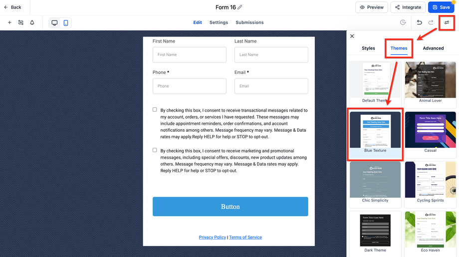 Wenn Button Themes über Formulare/Surveys hinweg wiederverwendbar sind, wende dasselbe Theme auf mehrere Assets an, um CTA zu standardisieren.