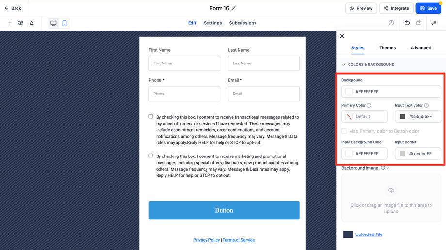 Nutze diese Einstellungen, um Hintergrund-, Textfeld- und Input-Border-Farben an dein Branding anzupassen.